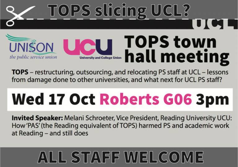 Meeting: TOPS – restructuring, outsourcing, and relocating PS staff at UCL – lessons from damage done to other universities, and what next for UCL PS staff?