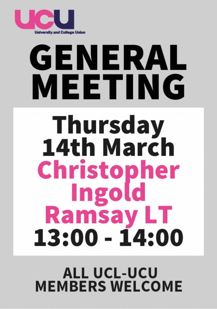 Our next General Meeting will take place Thursday 14 March, 1-2pm, in the Christopher Ingold Ramsay LT (Chemistry Building, Gordon St). This meeting is timetabled to enable members to raise motions and stand as delegates for the national annual UCU Congress.